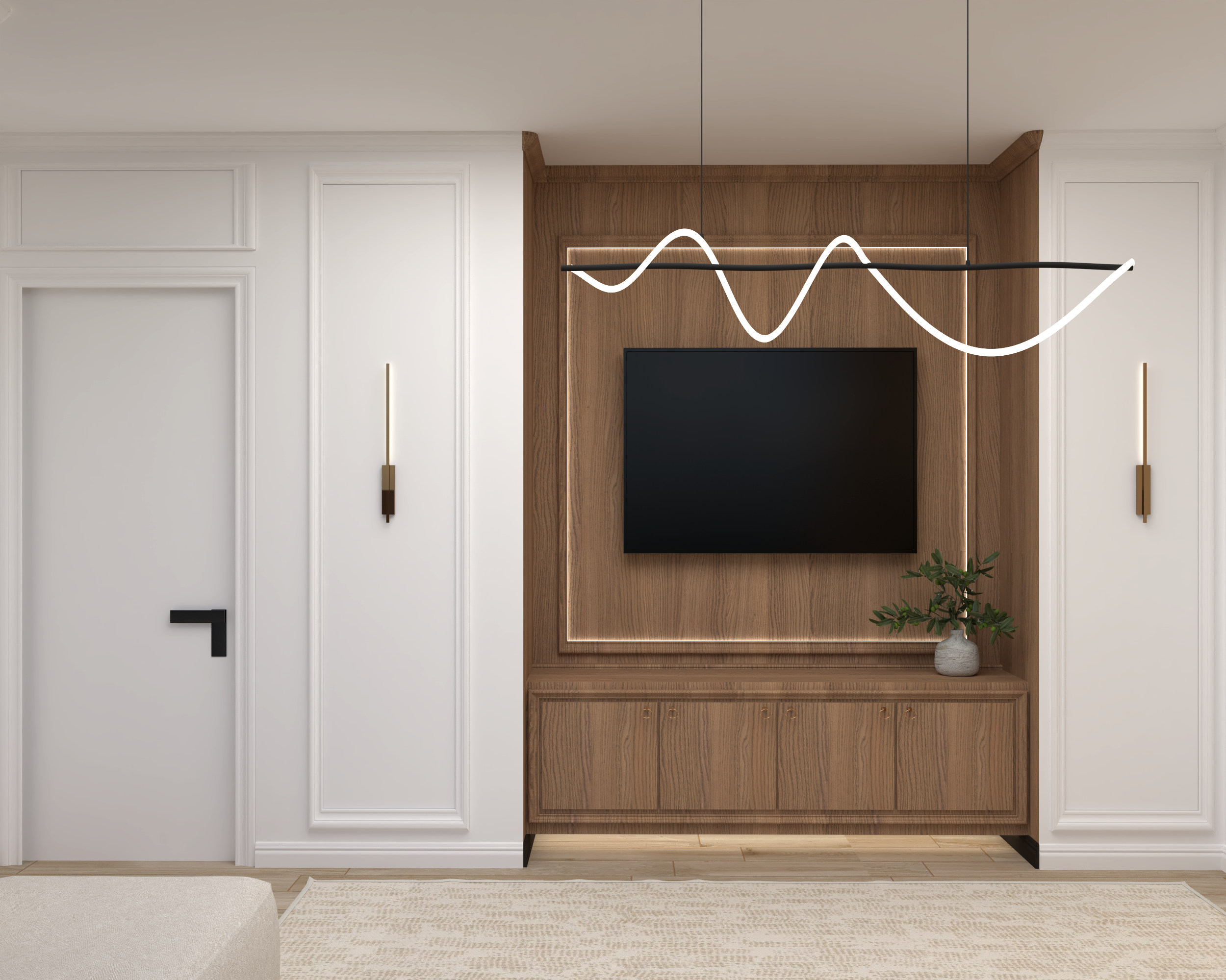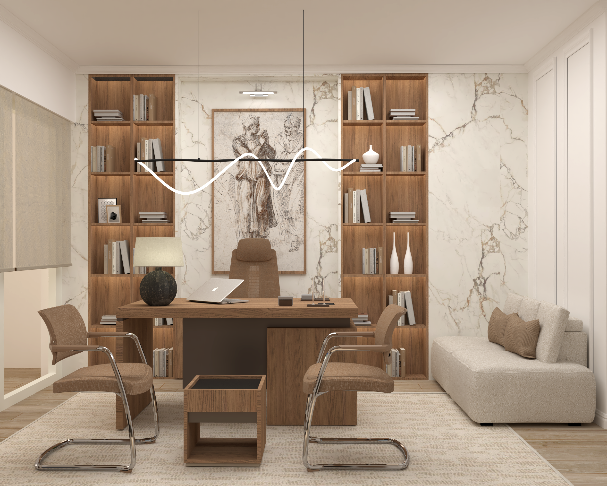 The simple, yet elegant decor, including the floating shelf with neatly arranged books, enhances the overall contemporary feel of the space. Perfect for a professional setting or a design studio.