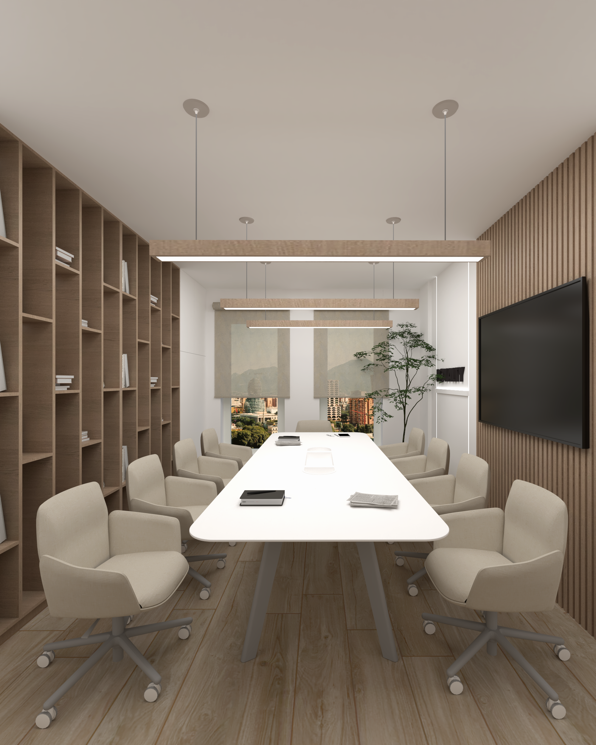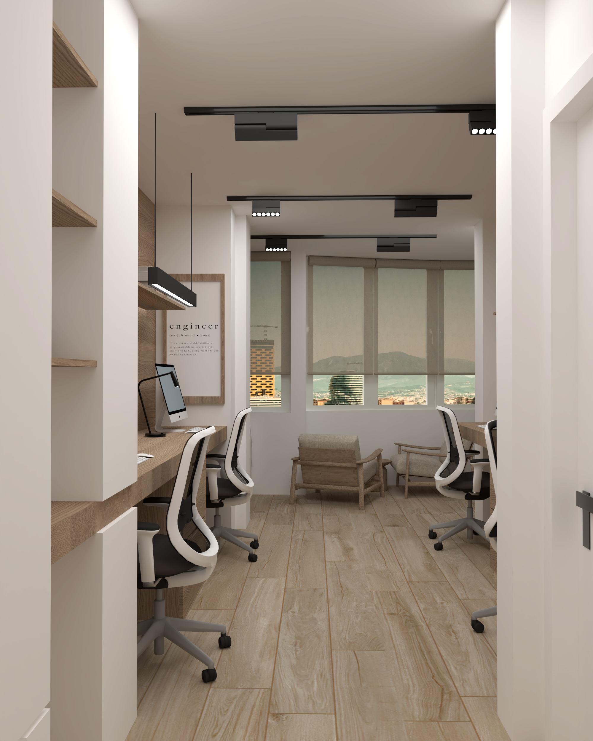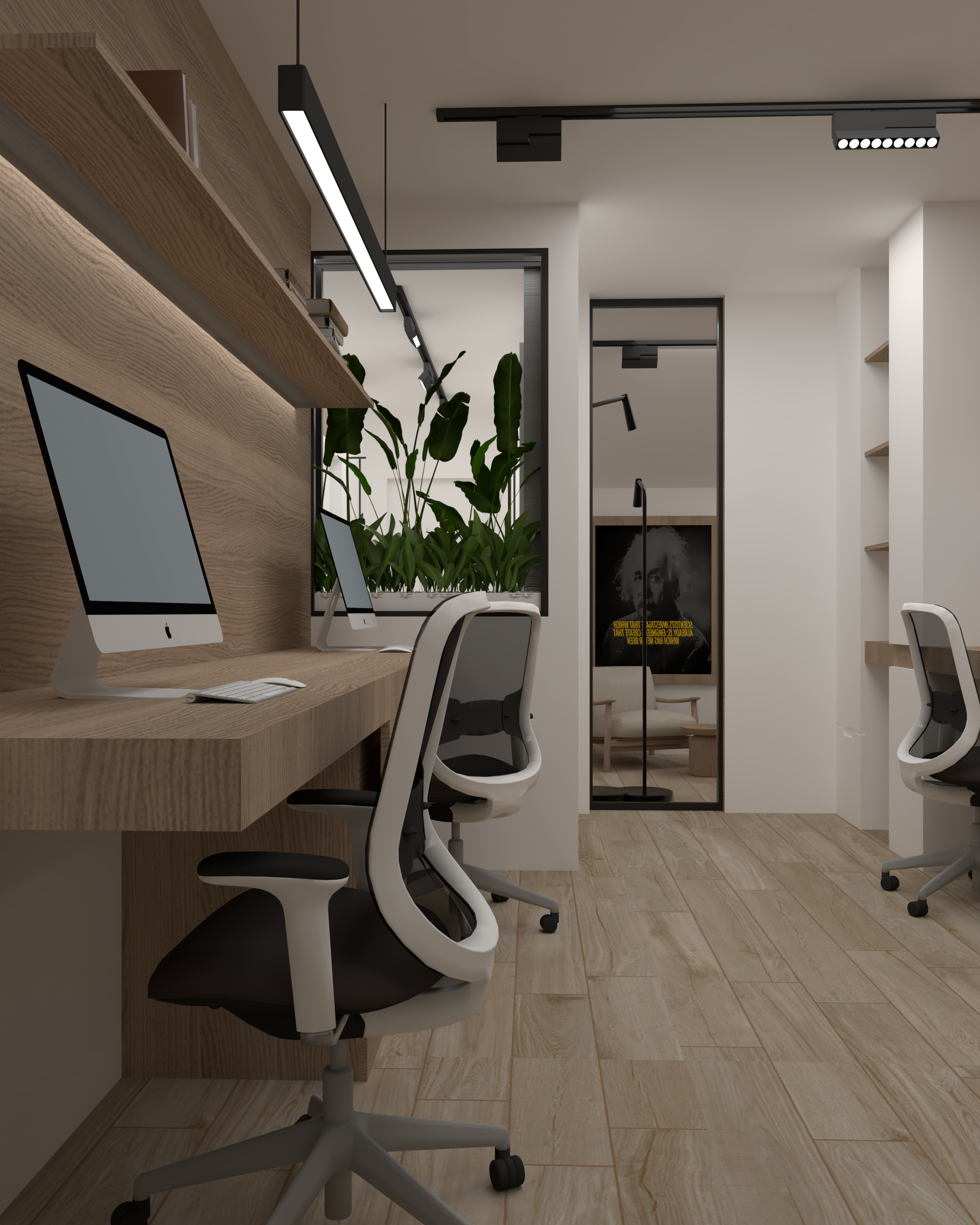 This modern office space features a clean, minimalistic design with a natural wood finish and soft lighting. The workspace is equipped with two ergonomic chairs, sleek desks, and Apple computers, making it ideal for both comfort and productivity. Large windows allow natural light to fill the room, offering a stunning view of the outdoors.