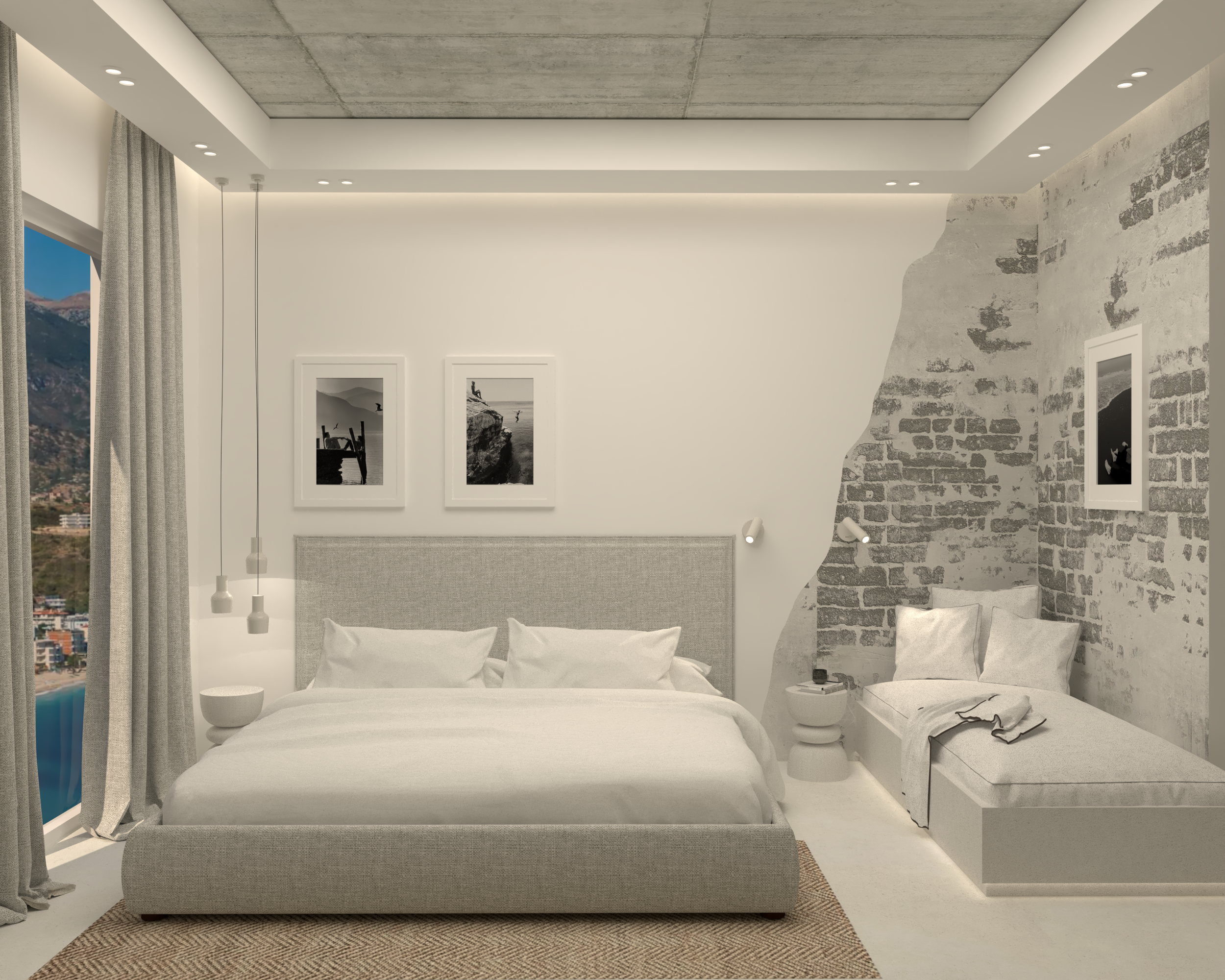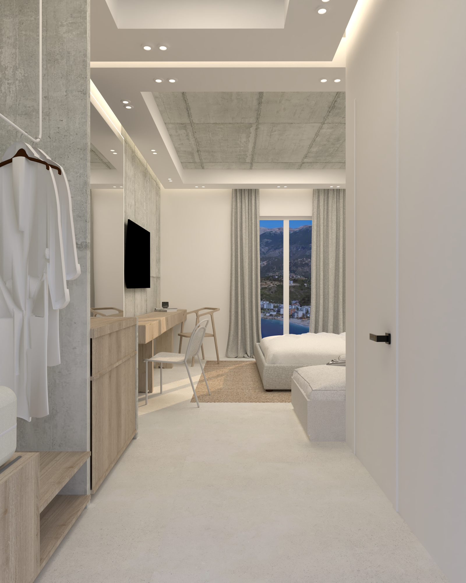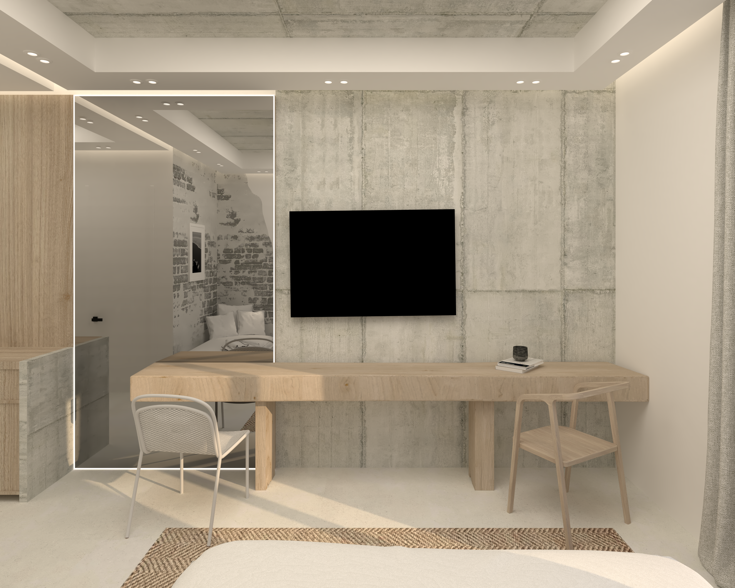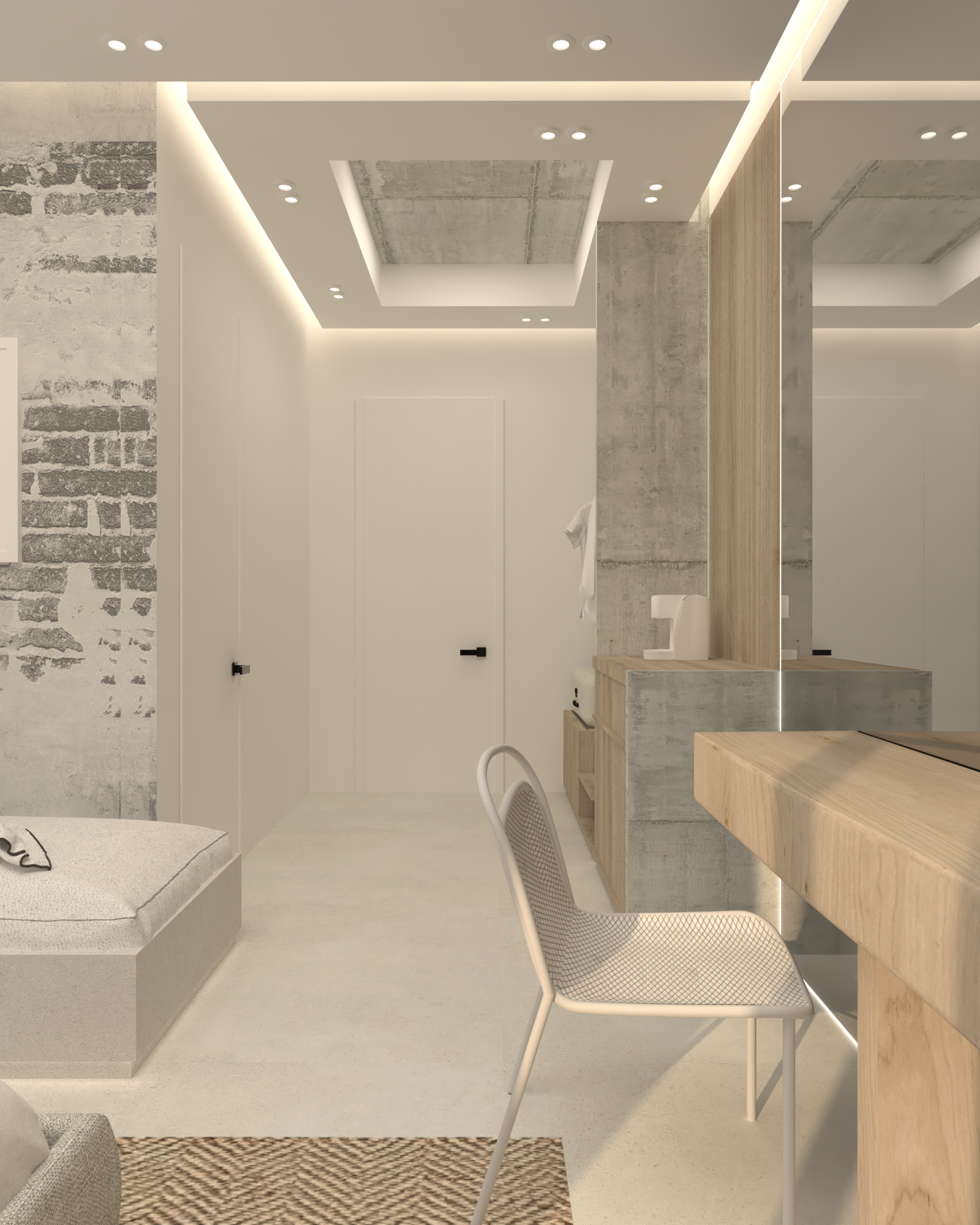 This room is designed as a quiet and contemporary sanctuary, where simplicity and texture shape the overall atmosphere. A soft palette of neutral tones is paired with natural materials and subtle lighting to create a calm and welcoming environment.