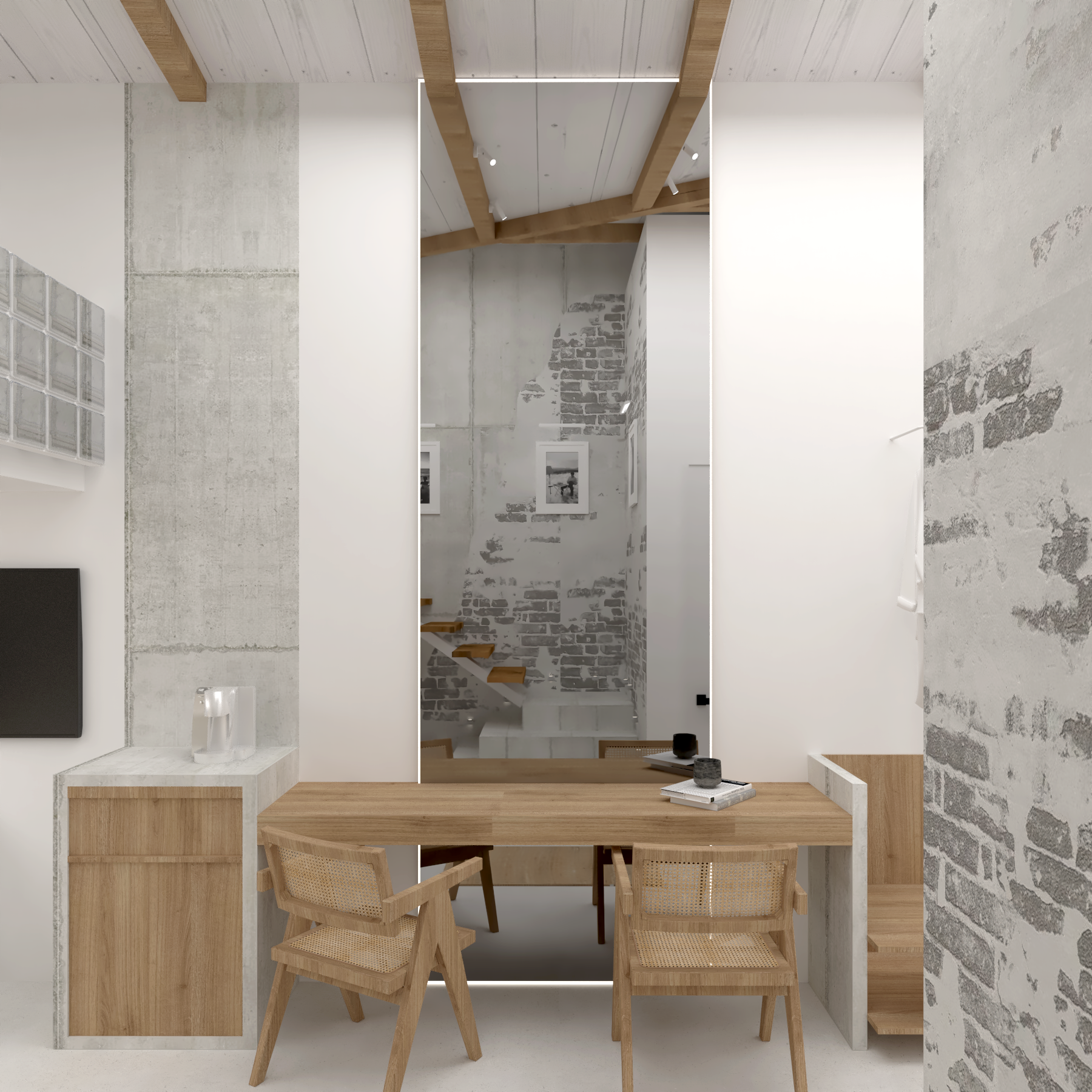 The space balances modern minimalism with raw architectural elements, such as exposed concrete and textured stone surfaces, which add depth and authenticity to the interior. The sculptural transition between materials becomes a defining feature, blending refined design with a sense of history and craftsmanship.