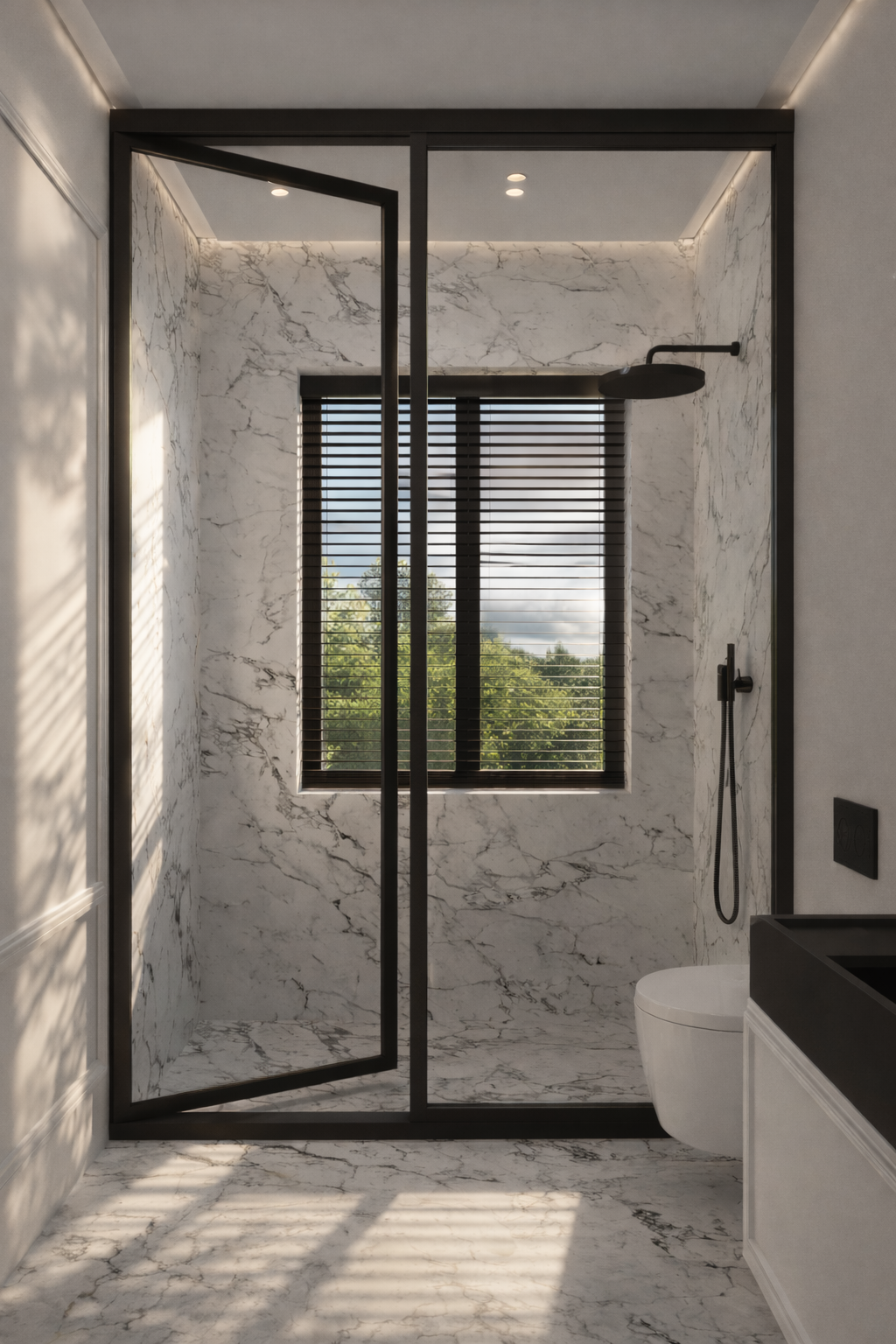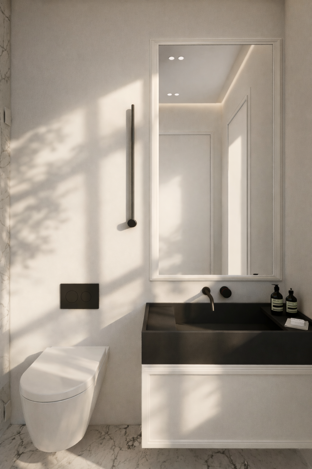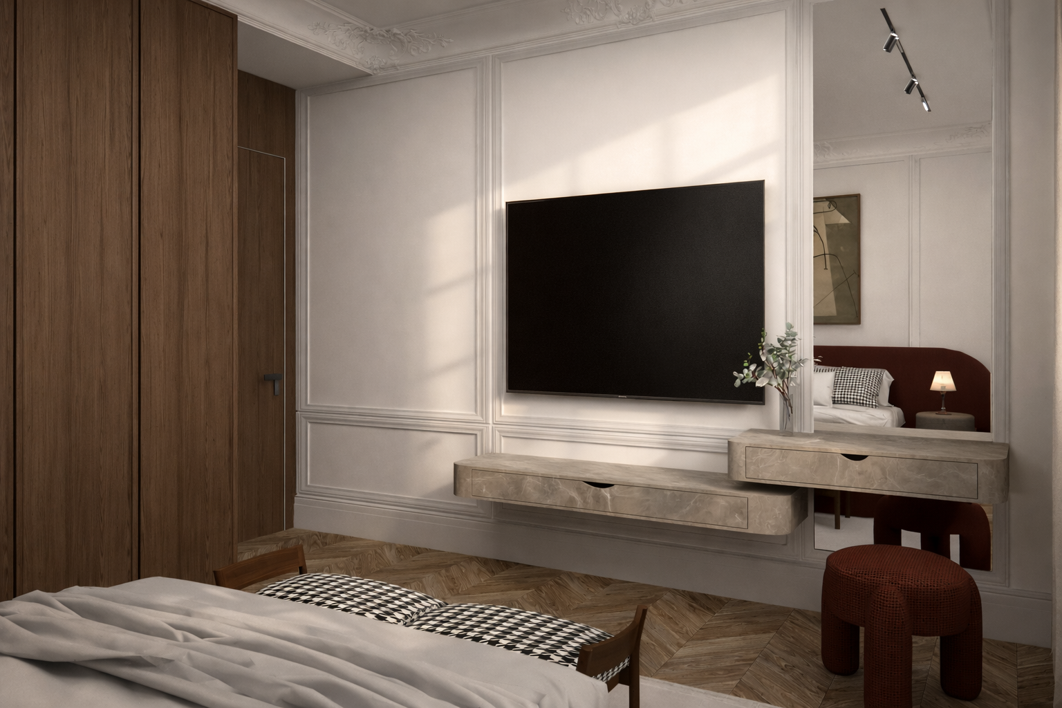 The room is complemented by minimalist shelving units, softly illuminated to showcase carefully curated decor pieces. The light wood accents and herringbone floor pattern add warmth and texture, enhancing the overall sense of balance and refinement. The clean, modern design is further highlighted by the sleek, white shelving and open space, providing a perfect setting for both relaxation and artistic expression.