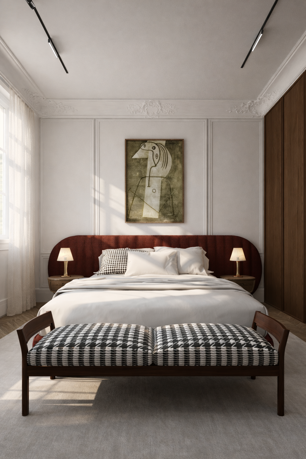 This contemporary living room combines clean lines with artistic flair. The focal point is a bold, cubist painting that adds personality and vibrancy to the neutral-toned space. The plush sofa in earthy tones creates a cozy atmosphere, while marble coffee tables bring in a touch of elegance.